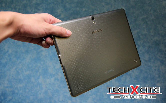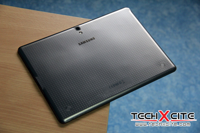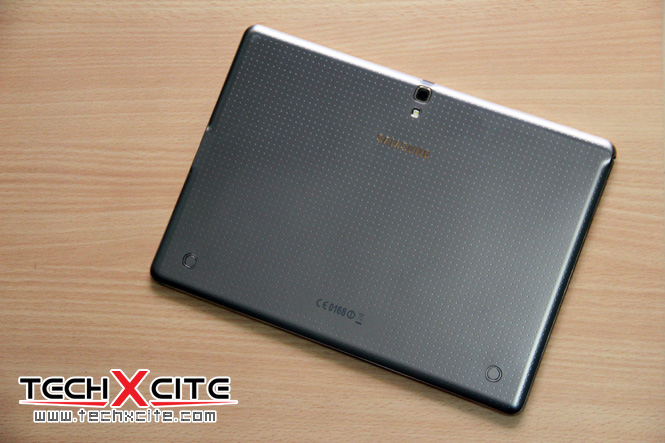แต่พอพลิกกลับมาด้านหลัง ก็จะเห็นความพรีเมี่ยมที่ต่างจากรุ่นก่อนอย่างเห็นได้ชัด หลังจากที่ Samsung ยึดกับดีไซน์ฝาหลังแบบ Faux Leather แบบหนังเทียมซึ่งใช้มาตั้งแต่รุ่น Galaxy Note 10.1 (2014 Edition)ยันมาถึงตระกูล Tab 4 แต่บน Galaxy Tab S นั้นมาพร้อมกับฝาหลังแบบ Dot Design คล้ายกับบนGalaxy S5